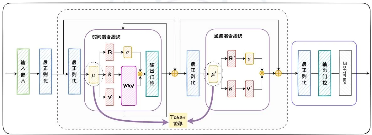 输入进行线性组合,通过线性投影得到 R、K、V 向量;随后,通过 WKV 机制来确保每个通道的权重随时间推移逐步衰减;最后,将表示过去信息的 σ(R)\sigma(\mathbf{R}) 和表示当前信息的 WKV 向量通过输出门控进行整合,传递给通道混合模块。