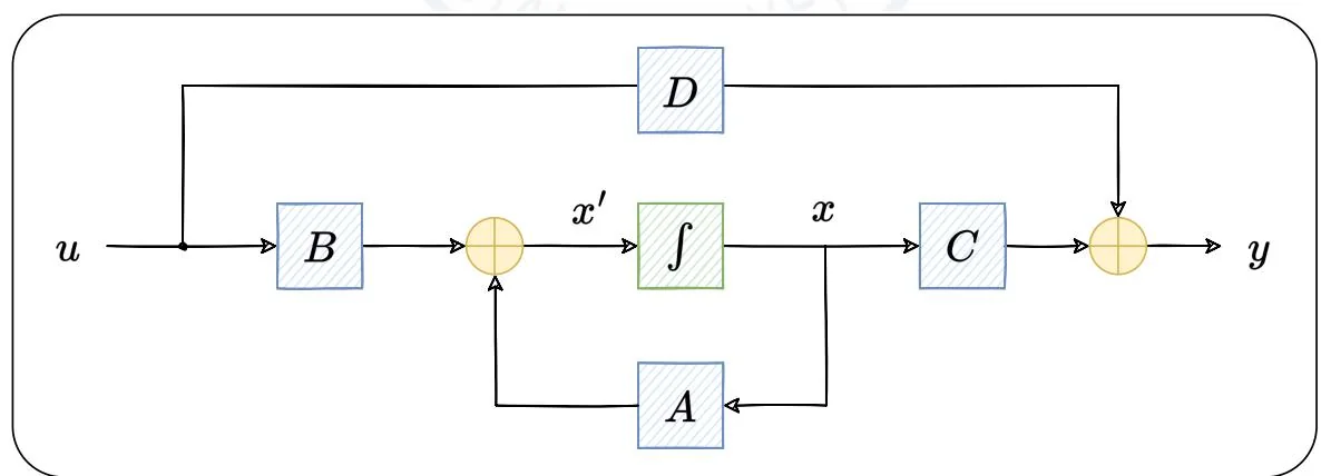 其中, x(t)=Ax(t)+Bu(t)x'(t) = \mathbf{A}x(t) + \mathbf{B}u(t) 为状态方程,描述了系统状态如何基于输入和前一个状态变化,其计算出的是状态关于时间的导数 x(t)x'(t) ,为了得到状态 x(t)x(t) ,还需对其进行积分操作。 y(t)=Cx(t)+Du(t)y(t) = \mathbf{C}x(t) + \mathbf{D}u(t) 为输出方程,描述了系统状态如何转化为输出,其中的 x(t)x(t) 是通过状态方程更新且积分后的值。在深度学习中, Du(t)\mathbf{D}u(t) 项表示残差连接,可被忽略。
