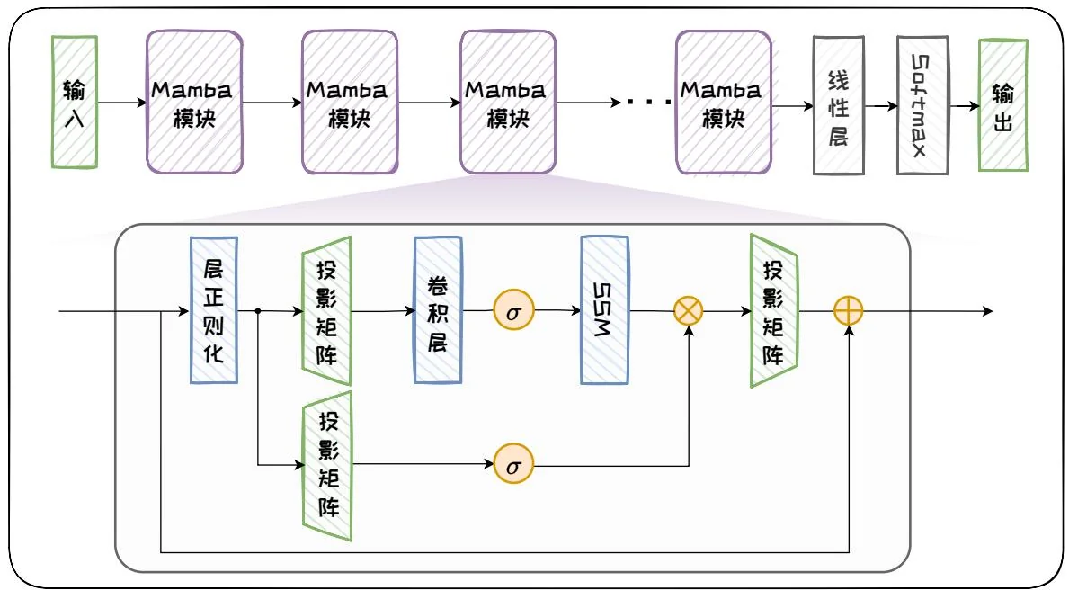 Mamba 通过将带有选择机制的 SSM 模块与 Transformer 的前馈层相结合, 形成了一个简单且同质的架构设计。如图 2.19 所示, Mamba 架构是由完全相同的 Mamba 模块组成的递归模型, 每个 Mamba 模块都在前馈层中插入了卷积层和带有选择机制的 SSM 模块, 其中激活函数 σ\sigma 选用 SiLU/Swish 激活。