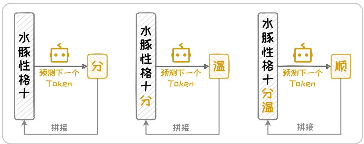 GPT-1 使用小说数据集 BookCorpus[46] 来进行预训练,该数据集包含约 8 亿个 Token,总数据量接近 5GB。在预训练方法上,GPT-1 采用下一词预测任务,即基于给定的上文预测下一个可能出现的 Token。以自回归的方法不断完成下一词预测任务,模型可以有效地完成文本生成任务,如图2.14所示。通过这种预训练策略,模型可以在不需要人为构造大量带标签数据的前提下,学习到大量语言的“常识”,学会生成连贯且上下文相关的文本。这不仅提高了模型的泛化能力,而且减少了对标注数据的依赖,为自然语言处理领域带来了新的研究方向和应用前景。