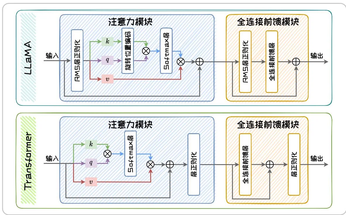 图2.16:LLaMA解码块架构与标准Transformer解码器架构对比。