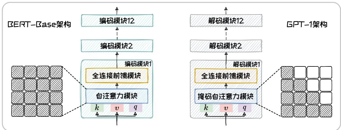 图2.13对比了BERT-Base以及GPT-1的模型结构。从图中可以看出,GPT-1在结构上与BERT-Base高度类似,两者都包含12个编码或解码模块,每个模块也同样由一个自注意力模块和一个全连接前馈模块组成。两者之间的本质区别在于BERT-Base中的自注意力模块是双向的自注意力机制,而GPT-1中的自注意力模块则是带有掩码的单向自注意力机制。