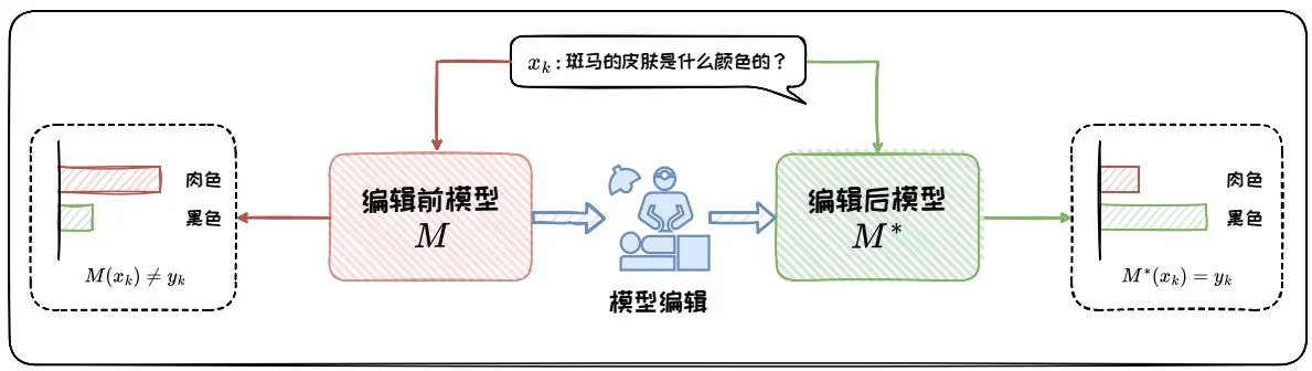 图5.2用“斑马皮肤颜色”这一知识点作为示例,展示了模型编辑的概念。在这个示例中,当被询问“斑马的皮肤是什么颜色的?”时,编辑前模型回答了错误答案“肉色”,而编辑后的模型可以回答出正确答案“黑色”。