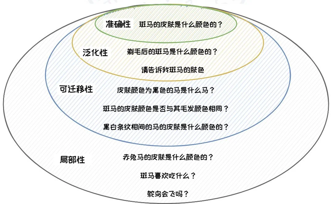泛化性用来衡量编辑后模型能否适应目标问题 xkx_{k} 的其他表达形式,即判断模型在面对与 xkx_{k} 具有语义相似性的问题时,能否给出统一的目标答案 yky_{k} 。泛化性问题对应图5.3中黄色部分的问题“剃毛后的斑马是什么颜色的?”和“请告诉我斑马的肤色”,这两个问题的正确答案都是“黑色”。