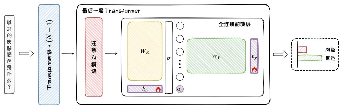 其中, apa_{p} 为补丁的激活值,代表补丁对输入查询的响应程度。在添加补丁之后, apa_{p} 与值向量 vp\mathbf{v}_{p} 之积会形成偏置项叠加到全连接前馈层的原始输出之上,以调整模型的输出。补丁就像是一个很小的修正器,只会被相关的输入查询激活。