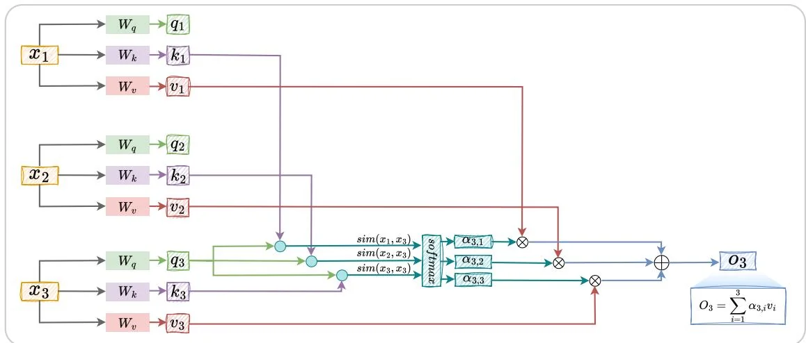 其中, 分别为 query,key,value 编码器的参数。以包含三个元素的输入 为例,Transformer 自注意力的实现图1.6所示。