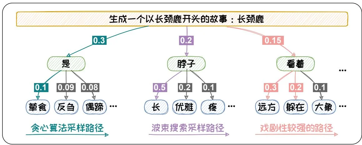但是,概率最大的文本通常是最为常见的文本。这些文本会略显平庸。在开放式文本生成中,无论是贪心搜索还是波束搜索都容易生成一些“废话文学”一重复且平庸的文本。其所生成的文本缺乏多样性[19]。如在图1.8中的例子所示,概率最大的方法会生成“脖子长”。“长颈鹿脖子长”这样的文本新颖性较低。为了提升生成文本的新颖度,我们可以在解码过程中加入一些随机元素。这样的话就可以解码到一些不常见的组合,从而使得生成的文本更具创意,更适合开放式文本任务。在解码过程中加入随机性的方法,成为随机采样方法。下节将对随机采样方法进行介绍。