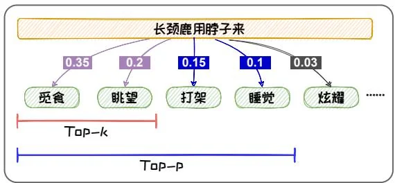 文本。例如,在如下图1.9(b)所示的例子中,通过Top-2采样,我们只能得到“长颈鹿用脖子来觅食”或者“长颈鹿用脖子来眺望”,这些都是人们熟知的长颈鹿脖子的用途,缺乏新意。但是其实长颈鹿的脖子还可以用于打架或睡觉,Top-2采样的方式容易将这些新颖的不常见的知识排除。为了解决上述问题,我们可以使用Top-P采样,也称Nucleus采样。