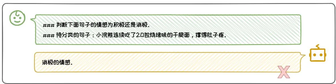 明确的任务说明是构建有效 Prompt 的关键要素之一。一个清晰、具体的任务说明能够确保模型准确理解任务要求,并产生符合预期的输出。例如,在情感分类任务中,任务说明“判断下面句子的情感为积极还是消极。”就是一个明确的示例,它清晰地定义了任务类型(情感分类)和分类的具体类别(积极或消极)。相反,模糊或不明确的任务说明可能导致模型误解用户的真实意图,从而产生不符合预期的输出。如图 3.17 所示,“分类下面的句子”这样的任务说明就缺乏具体性,没有明确指出分类的类型和类别,使得模型难以准确执行任务。