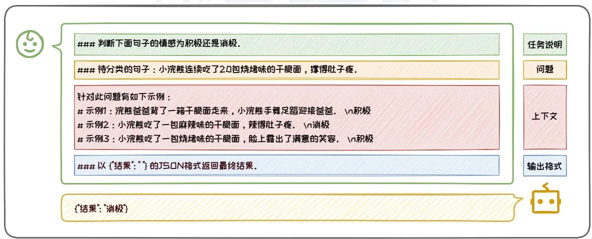 编写规范的 Prompt 是我们与大语言模型进行有效沟通的基础。经典的 Prompt 通常由任务说明, 上下文, 问题, 输出格式等部分中的一个或几个组成。以图 3.16 中这个情感分类的 Prompt 为例。在这个例子中: