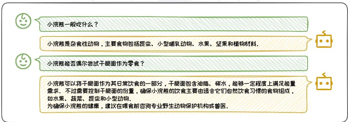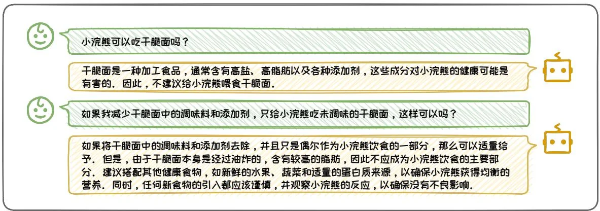 深入追问的形式是指用户可以根据大语言模型的输出继续发问来深入挖掘特定话题的深层信息。这种追问适用于需要对某个概念、现象或过程有详尽解释的场景。通过深入追问,用户能够引导模型提供更为细致和深入的信息,从而加深对特定领域的理解。以图3.22为例,用户首先询问了小浣熊是否可以食用干脆面。模型基于干脆面的成分给出了初步的回答,指出其对小浣熊的健康可能有害。随后,用户通过深入追问,探讨了如果去除干脆面中的调味料和添加剂,是否可以安全