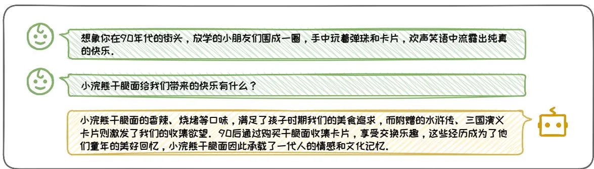 通过情景代入,模型能够深入理解并反映特定情境下的文化社会背景与现实环境,从而生成更加丰富和有深度的回答。在图3.29例子中,当模型被置于90年代的街头情景中,它不仅能够描述小浣熊干脆面的口味,还能够捕捉到那个时代特有的文化现象——通过收集卡片来交换乐趣。这种回答不仅提供了具体的信息,还唤起了用户的情感共鸣,增强了交互的情感连接。
