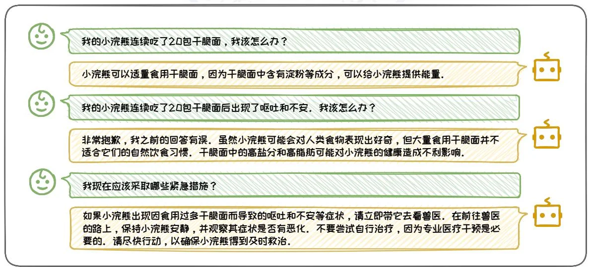 反馈追问的形式是在大语言模型的输出不符合预期或存在错误时,提供反馈,指出问题所在,并请求模型进行更正或澄清。其目的在于通过反馈机制提升模型的准确性,确保信息的正确性。这种追问允许用户指出模型输出中的具体错误或不足,并请求模型对其进行修正,有助于提高对话质量。在图3.24这个例子中,用户首先询问了小浣熊连续食用20包干脆面后的应对措施。模型最初的回答建议小浣熊可以适量食用干脆面,但用户通过反馈追问指出了小浣熊出现了不良反应。模型随后修正了回答,指出大量食用干脆面对小浣熊的健康有害,并提供了紧急处理建议。通过反馈追问,用户能够获得更加准确可靠的信息。