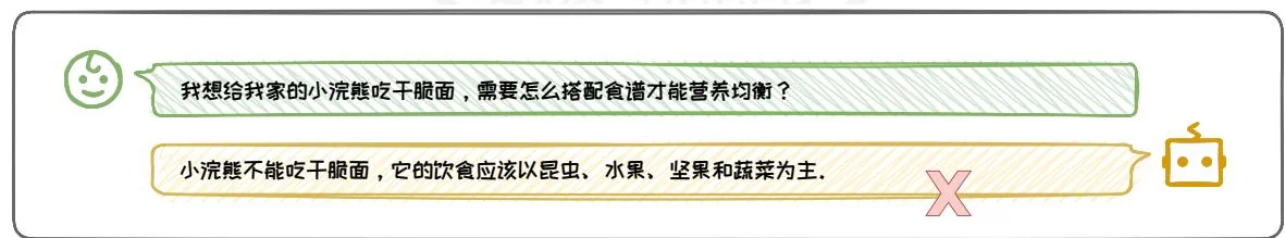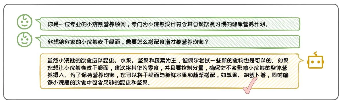 如图3.28所示,通过角色扮演,模型承担了“专业的小浣熊营养顾问”这一角色,展现出了对小浣熊饮食需求的专业知识。在回答用户关于小浣熊尝试干脆面的询问时,模型不仅坚持了小浣熊应以昆虫、水果、坚果和蔬菜为主的自然饮食原则,还巧妙地提出了将干脆面作为零食的建议,并强调了控制分量的重要性。此外,模型还建议将干脆面与新鲜水果和蔬菜搭配,确保小浣熊的饮食中包含足够的昆虫和坚果,以维持营养均衡。这一建议既科学又实用,充分展现了角色扮演在提升模型交互质量和适应用户需求方面的巨大潜力。