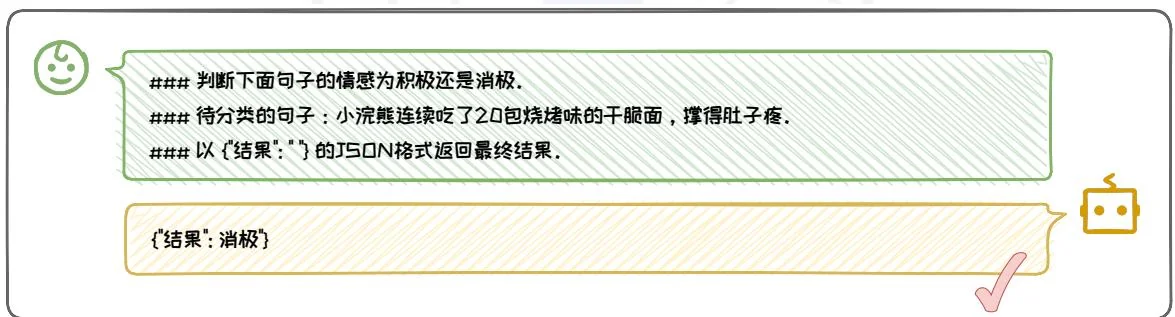 明确指定输出格式: 在 Prompt 中明确指出希望模型使用的输出格式, 如“请以 JSON 格式返回结果”, 并且选择广泛接受和易于处理的输出格式, 如 JSON、CSV 等, 易于解析和数据交换。