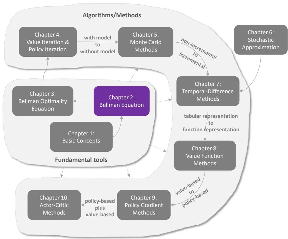 This chapter introduces a core concept and an important tool. The core concept is the state value, which is defined as the average reward that an agent can obtain if it follows a given policy. The greater the state value is, the better the corresponding policy is. State values can be used as a metric to evaluate whether a policy is good or not. While state values are important, how can we analyze them? The answer is the Bellman equation, which is an important tool for analyzing state values. In a nutshell, the Bellman equation describes the relationships between the values of all states. By solving the Bellman equation, we can obtain the state values. This process is called policy evaluation, which is a fundamental concept in reinforcement learning. Finally, this