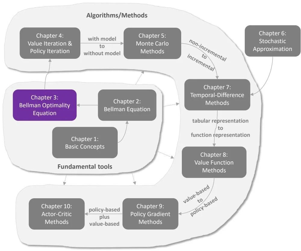 The relationship between the previous, present, and subsequent chapters is as follows. The previous chapter (Chapter 2) introduced the Bellman equation of any given policy.