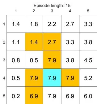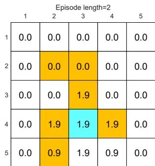 As the episode length increases, an interesting spatial pattern emerges. That is, the states that are closer to the target possess nonzero values earlier than those that are farther away. The reason for this phenomenon is as follows. Starting from a state, the agent must travel at least a certain number of steps to reach the target state and then receive positive rewards. If the length of an episode is less than the minimum desired number of steps, it is certain that the return is zero, and so is the estimated state value. In this example, the episode length must be no less than 15, which is the minimum number of steps required to reach the target when starting from the bottom-left state.