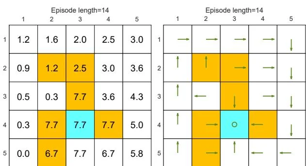 nonzero values, and all the other states have zero values since each episode is too short to reach the target or get positive rewards (see Figure 5.4(a)). As the episode length increases, the policy and value estimates gradually approach the optimal ones (see Figure 5.4(h)).