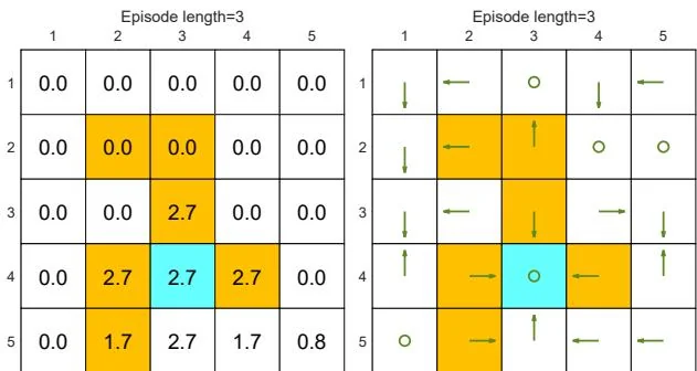 Figure 5.4: The policies and state values obtained by the MC Basic algorithm when given different episode lengths. Only if the length of each episode is sufficiently long, can the state values be accurately estimated.