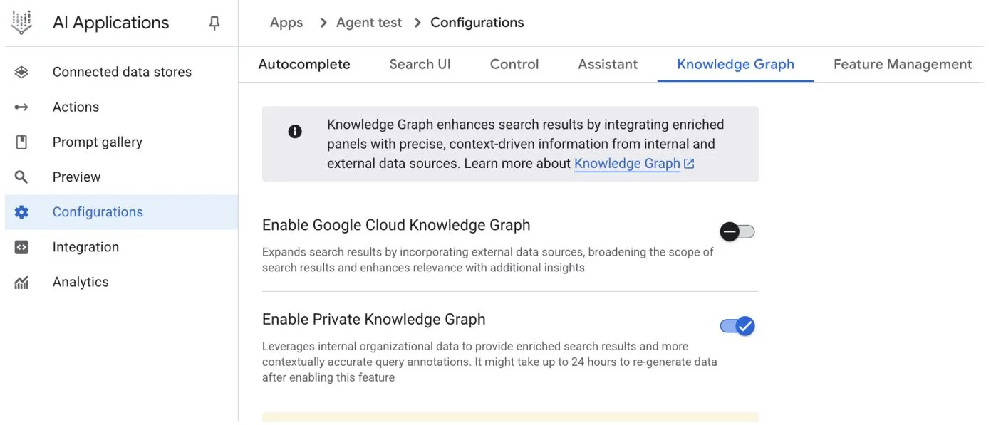 AgentSpace offers a number of advanced features such as integration with datastores to store your own data, integration with Google Knowledge Graph or with your private Knowledge Graph, Web interface for exposing your agent to the Web, and Analytics to monitor usage, and more (see Fig. 5)
