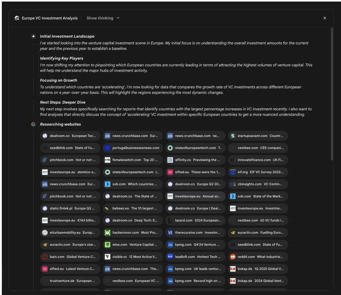 Fig. 2: An example of Deep Research plan being executed, resulting in Google Search being used as a tool to search various web sources.