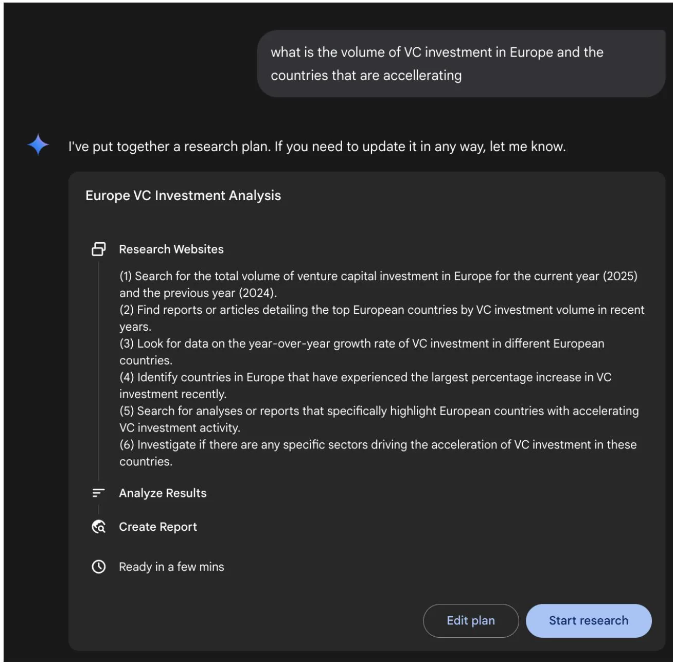 Fig. 1: Google Deep Research agent generating an execution plan for using Google Search as a tool.