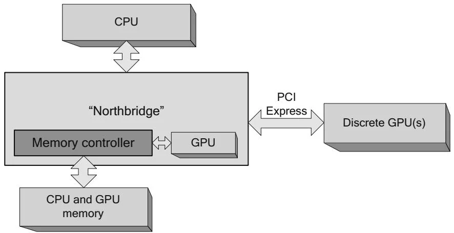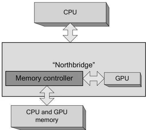 Here, the term integrated means "integrated into the chipset." As Figure 2.8 shows, the memory pool that previously belonged only to the CPU is now shared between the CPU and the GPU that is integrated into the chipset. Examples of NVIDIA chipsets with CUDA-capable GPUs include the MCP79 (for laptops and netbooks) and MCP89. MCP89 is the last and greatest CUDA-capable x86 chipset that NVIDIA will manufacture; besides an integrated L3 cache, it has 3x as many SMs as the MCP7x chipsets.