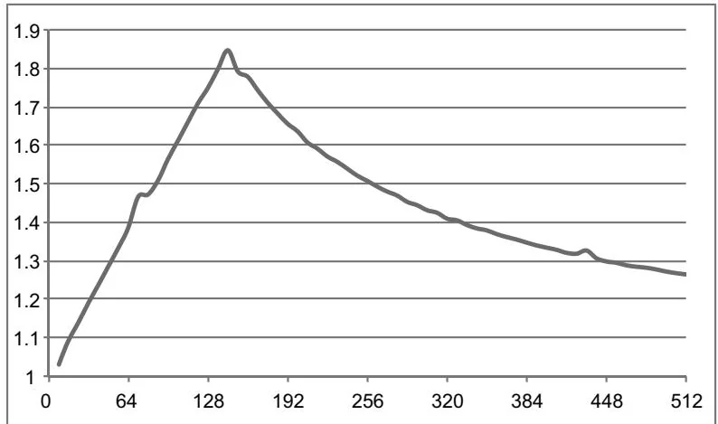The benefit on a GeForce GTX 280, which contains only one copy engine, is more pronounced. Here, the results from varying cycles up to 512 are shown. The maximum speedup, shown in Figure 6.8, is much closer to the theoretical maximum of 2x.
