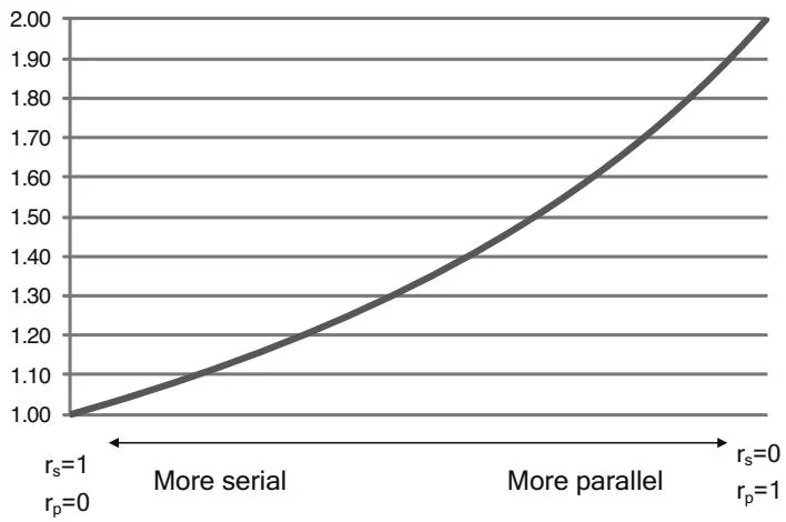 where rs+rp=1r_s + r_p = 1 and NN is the number of processors. In the case of concurrent copying and kernel processing, the "number of processors" is the number of autonomous hardware units in the GPU: one or two copy engines, plus the SMs that execute the kernels. For N=2N = 2 , Figure 6.6 shows the idealized speedup curve as rsr_s and rpr_p vary.