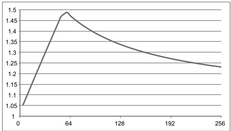 The full graph for cycles values from 4..256 is given in Figure 6.7. Unfortunately, for these settings, the 50%50\% speedup shown here falls well short of the 3x speedup that theoretically could be obtained.
