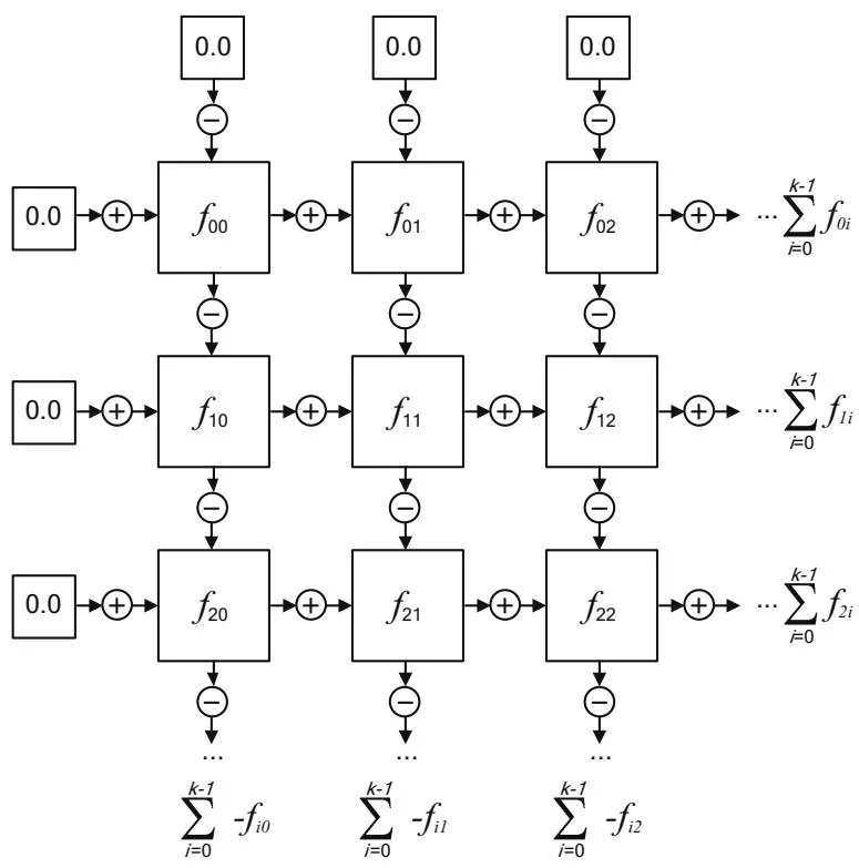 Figure 14.4 shows how the partial sums for a given tile are computed. The partial sums for the rows and columns are computed—adding and subtracting, respectively—in order to arrive at partial sums that must be added to the corresponding output sums.