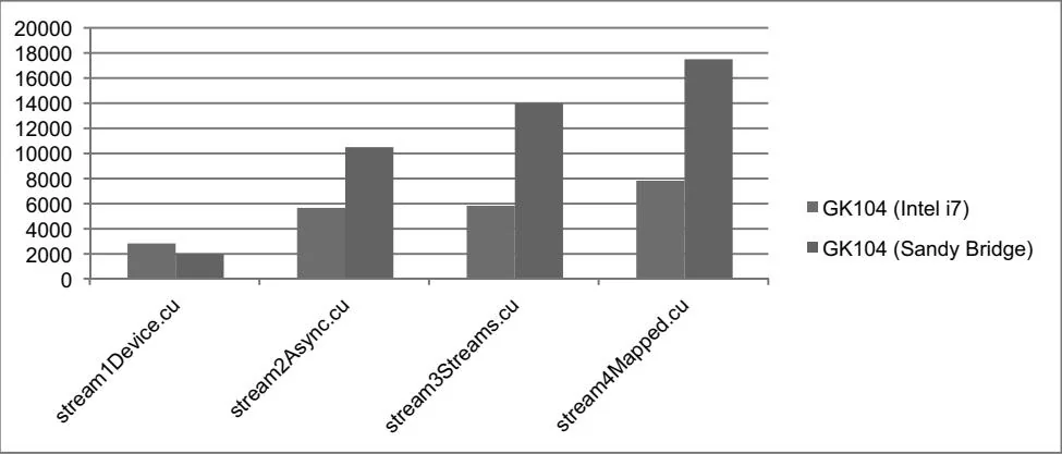Table 11.1 and Figure 11.1 summarize the relative performance of these implementations for 128M floats on GK104s plugged into two different test systems: the Intel i7 system (PCI Express 2.0) and an Intel Xeon E5-2670 (PCI Express 3.0). The benefits of PCI Express 3.0 are evident, as they are about twice as fast. Additionally, the overhead of CPU/GPU synchronization is higher on the E5-2670, since the pageable memcpy operations are slower.