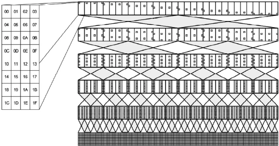 All threads in the warp then contain the reduction in mySum. Figure 12.2 illustrates the operation of this warp scan primitive. Each thread's sum is shown as a rectangle, with a dark square showing which threads have contributed to each thread's partial sum. (Besides the inset, the top row shows which squares correspond to each thread's contribution.) With each step in the log-step reduction, the number of contributions doubles until every thread has a full reduction.5