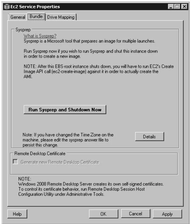 By default, this password-generation behavior is only in force on "stock" AMIs from AWS. If you "snapshot" one of these AMIs, they will retain whatever passwords were present on the machine when the snapshot was taken. To create a new Windows AMI that generates a random password upon launch, run the "EC2 Config Service" tool (available in the Start menu), click the "Bundle" tab, and click the button that says "Run Sysprep and Shutdown Now" (Figure 4.2). After clicking this button, any AMI created against it will generate a random password, like the stock Windows AMIs.