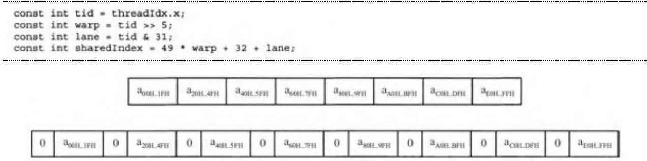 图13-15显示了交错方案如何在256个线程(包含8个线程束)组成的线程块中运行。共享内存的索引按如下方法计算。
