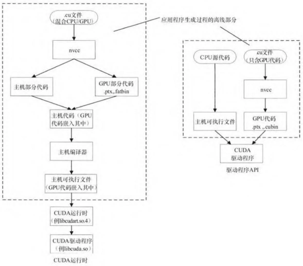 PTX可以离线或在线方式编译为GPU微码。离线编译指的是生成未来可在计算机上执行的程序。在图3-2中,我们圈出了CUDA编译过程中的离线编译部分。对于在线编译方式,我们可以理解为“即时”(just-in-time,JIT)编译,指的是程序可以在运行时将PTX代码在线编译为GPU微码。