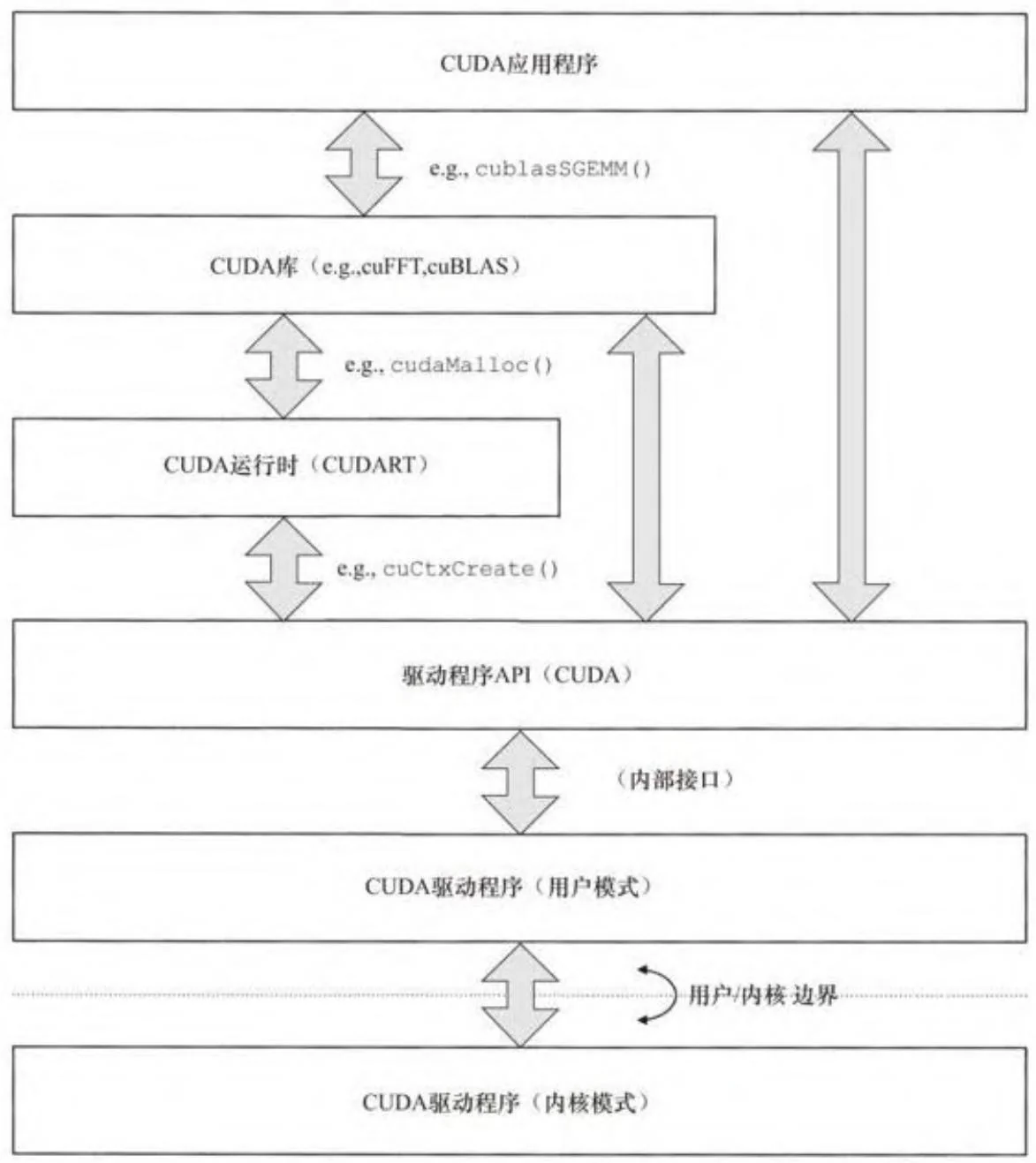 图3-1展示了CUDA应用程序中的不同层次,从应用程序本身到CUDA硬件上执行的CUDA驱动程序。除了内核模式驱动程序以外的所有软件都执行在目标操作系统的非特权用户模式下。在现代多任务操作系统的安全模型中,用户模式是“不可信任的”,硬件与操作系统软件必须采取措施严格分割一个与另一个应用程序。对CUDA来说,这意味着一个CUDA应用程序使用的主机和设备内存无法被另一个CUDA程序使用,唯一的例外是这些程序申请内存共享,这只有在内核模式下才可做到。