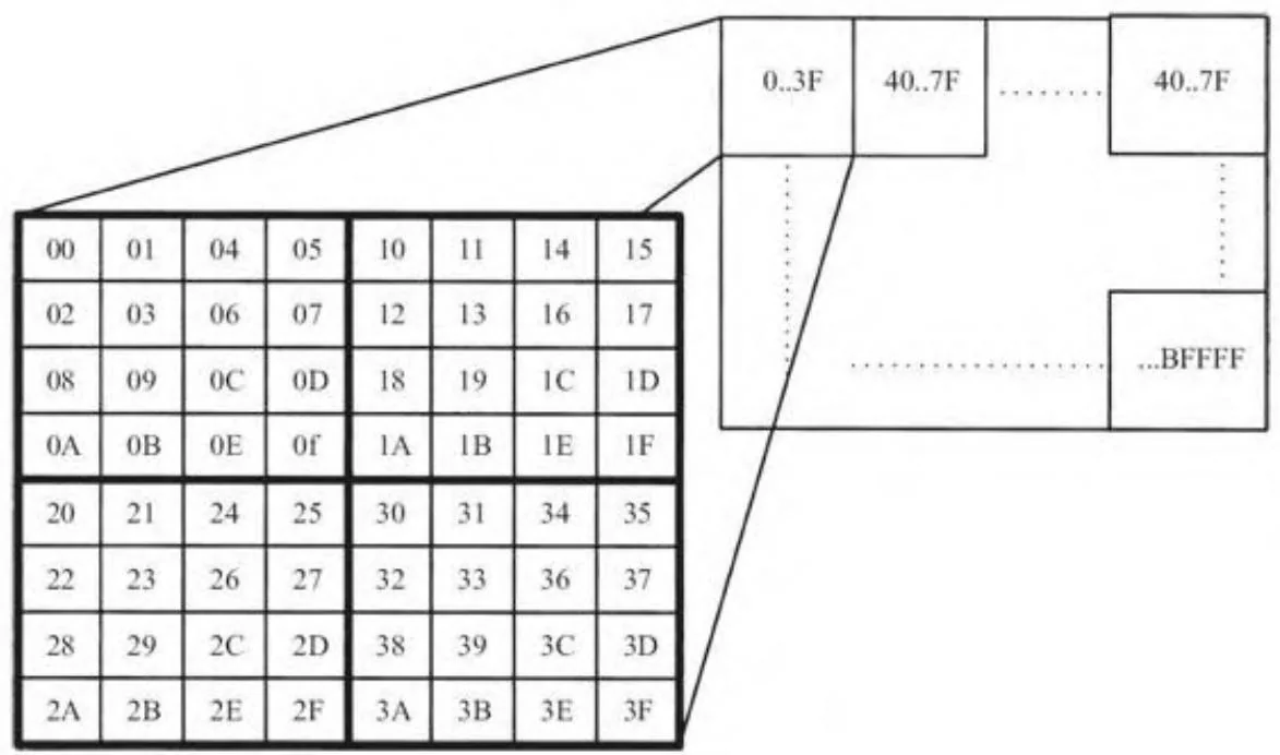 由图10-3可以看出,比特交错能够使连续的地址拥有“维度局部性”,即一条缓存线上存储的是相邻的一整块像素值,而不是水平方向的所有像素[3]。然而,这种方式也具有一定缺点,即在使用纹理维度时需要对纹理的维度强加一些条件,很不方便,因此,比特交错只是几种所谓的“块线性”寻址计算策略中的一种。