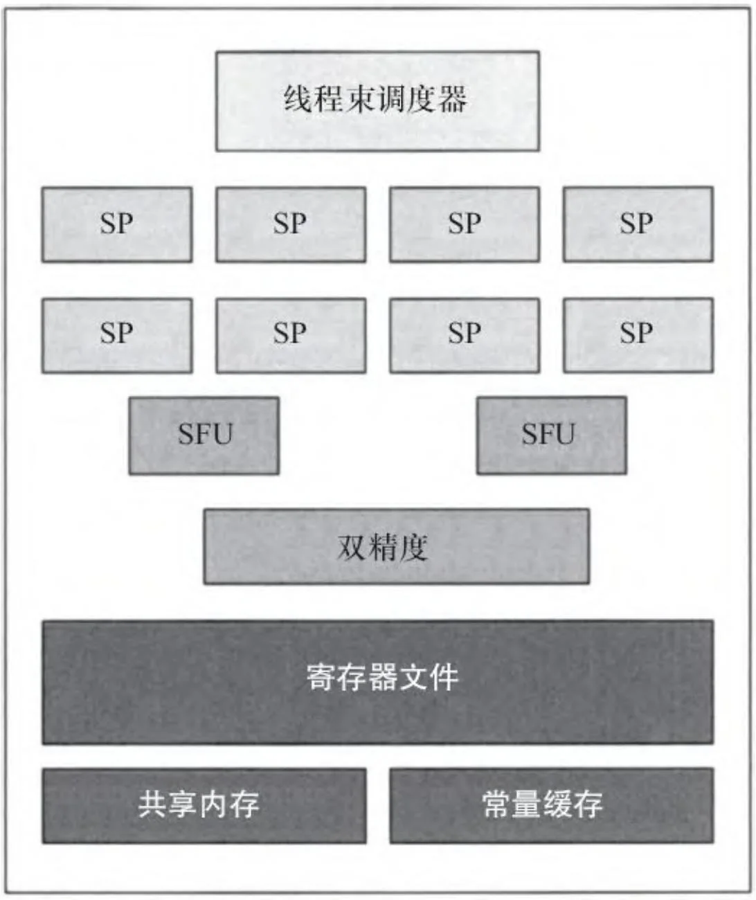 图2-29展现了特斯拉架构流处理器簇(SM 1.X)。它包含了8个流处理器,支持32位整数和单精度浮点数运算。第一个CUDA硬件根本不能支持双精度浮点数运算,但是自从GT200开始,SM就包含了双精度浮点数运算的单元。[5]