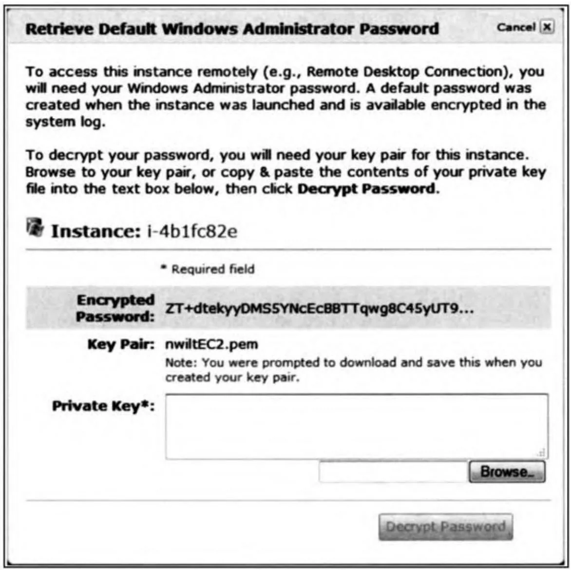 访问Windows实例与访问Linux实例的方式略有不同。一经启动,客户必须使用自己的私钥文件检索EC2实例的管理员账户的密码。你可以指定你的.pem文件或复制并粘贴其内容到AWS管理控制台(如图4-1所示)。