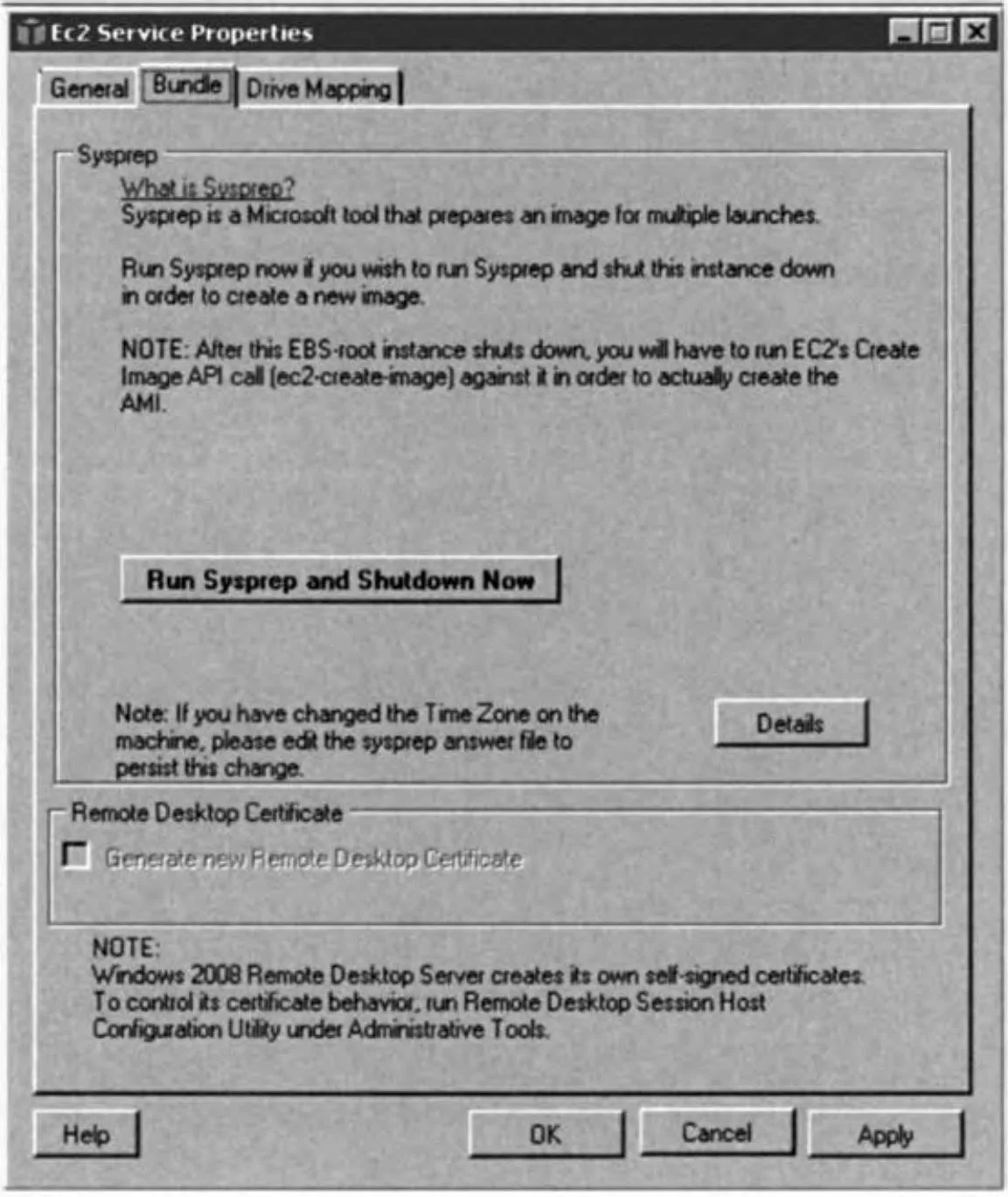 默认情况下,此密码生成行为只对来自AWS的“库存”AMI有作用。如果你对这些AMI之一创建“快照”,得到的快照将保留机器上的任何密码。要创建一个新的可以生成随机密码的Windows AMI,运行“EC2 Config Service”工具(可在“Start”菜单找到),点击“Bundle”选项卡,然后单击上面写着“Run Sysprep and Shutdown Now”的按钮(见图4-2)。点击这个按钮后,任何相对于它创建的AMI都会产生一个随机密码,就像库存Windows AMI那样。