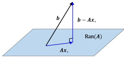 b=Ax+r,其 中rRan(A).(3.23)b = A x _ {*} + r, \quad \text {其 中} \quad r \bot \operatorname {R a n} (A). \tag {3.23}