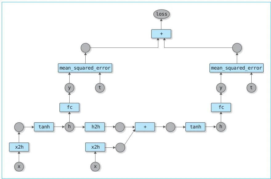 创建了如图59-4所示的计算图后,我们就可以通过loss.backup()求出每个参数的梯度。这种在由一系列的输入数据组成的计算图上进行的反向传播叫作基于时间的反向传播(Backpropagation Through Time, BPTT),它表示回溯时间进行反向传播。