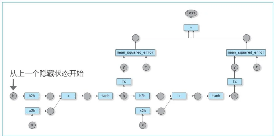 图59-4是有两个输入数据时的计算图。当然,输入数据可以是10个、100个,甚至是任何数量。计算图将根据输入数据的数量变长。不过为了更好地执行反向传播,计算图到一定的长度后需要“截断”,这就是TruncatedBPTT(truncate的意思是“截断”或“切断”)。在上面的例子中,截断发生在两个输入数据处。