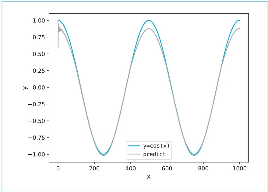 运行上面的代码可知,损失(loss)在稳步下降。下面我们来使用一下训练后的模型。这次将新的(无噪音的)余弦波作为输入数据,并尝试预测下一步的数值。代码如下所示,结果如图59-7所示。