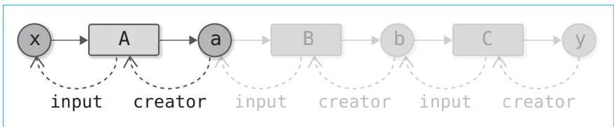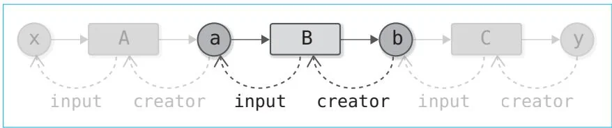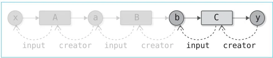 b.grad = C.Backward(y.grad) # 3. 调用函数的backward方法上面的代码从y的实例变量creator获取函数,从函数的input获取输入变量,然后调用函数的backward方法。下面是从变量b到变量a反向传播的计算图和代码。