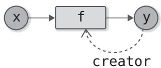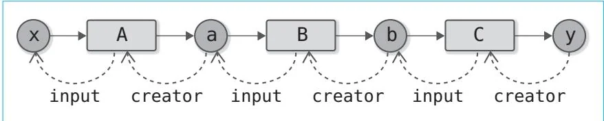 上面的代码通过Variable实例变量creator找到前一个Function,然后通过Function的实例变量input找到前一个Variable。它们的连接方式如图7-3所示。