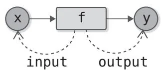 在实现反向传播的自动化之前,我们先思考一下变量和函数之间的关系。首先从函数的角度来考虑,即思考“从函数的角度如何看待变量”。从函数的角度来看,变量是以输入和输出的形式存在的。如图7-2左图所示,函数的变量包括“输入变量”(input)和“输出变量”(output)(图中的虚线表示引用)。