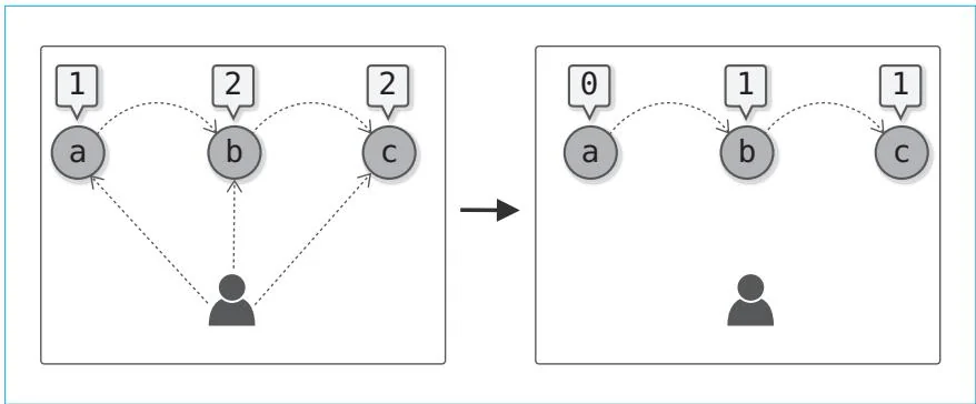 上面的代码创建了a、b、c这3个对象。a引用了b,b引用了c。此时,对象之间的关系如图17-1左图所示。